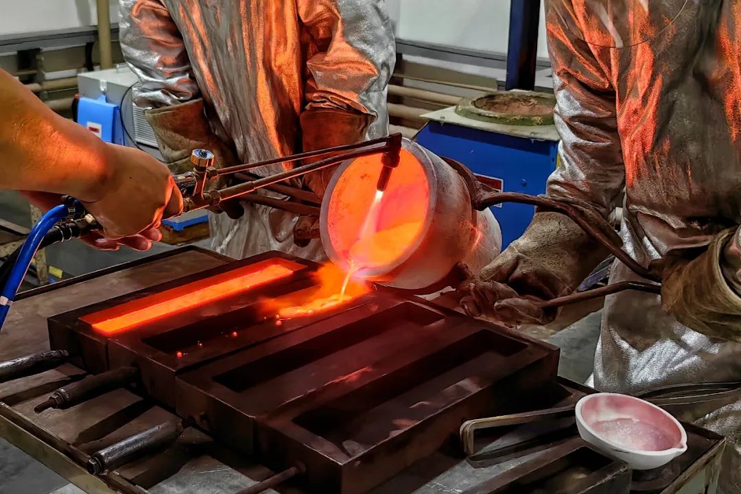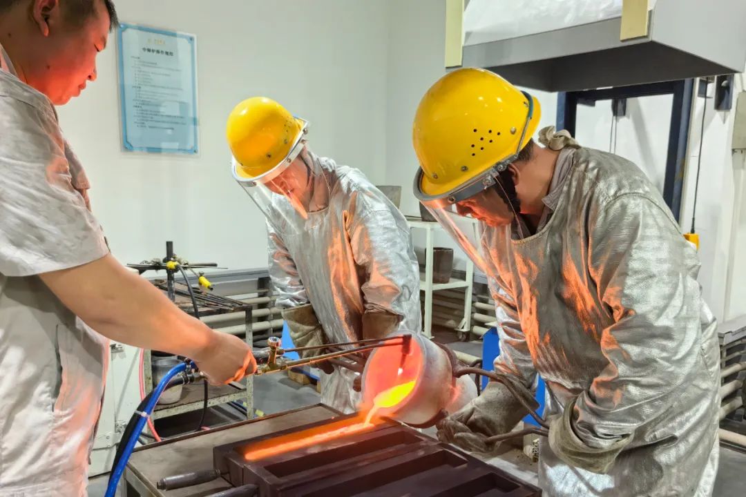 一小時后,坩堝中的金料已經(jīng)變成了金水,張文龍喊了兩位同事,共同進(jìn)行澆鑄這一環(huán)節(jié)。其中一位同事李玉奇,今年52歲,在工廠已經(jīng)十年了,算是張文龍的師父。他們都做好全身防護(hù),戴上安全頭盔,放下面罩,二人合力將坩堝抬起,將金水倒入模具中。