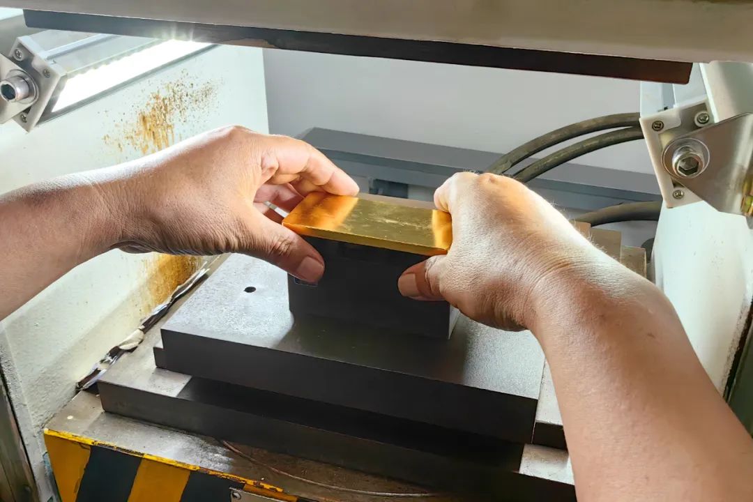 等金錠擦拭完畢,后續(xù)要在金錠上打鋼印,算是給每塊金錠一個身份認(rèn)證。最后在經(jīng)過表觀檢驗之后,這樣一塊1千克的標(biāo)準(zhǔn)金錠就可以出貨了。